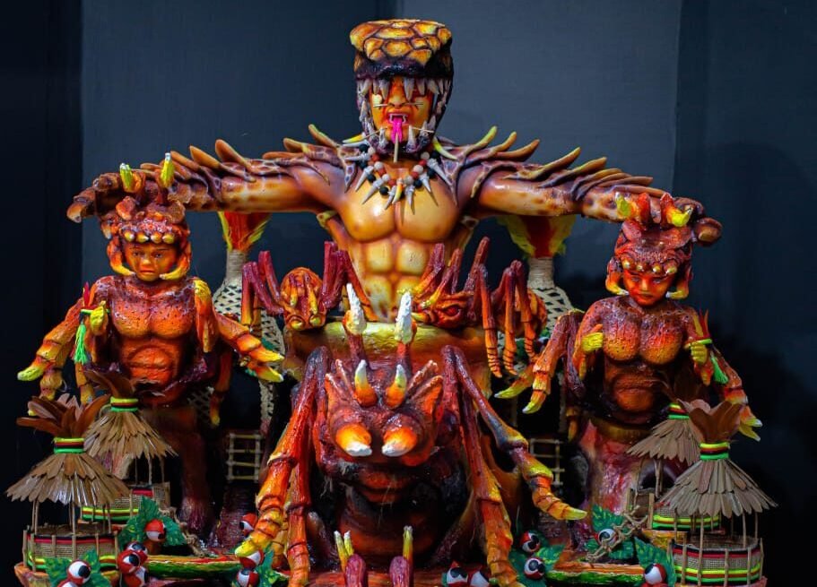 Entre as miniaturas que ficarão disponíveis ao público, Marialvo destaca a que representa o “Ritual Kawahiva”, que estreou no festival de 2019, uma das maiores alegorias que o artista já concebeu. O ritual é da cosmologia Kawahiwa-Parintintin, na qual índios caçadores da tribo são preparados, física e espiritualmente, pelo Pajé antes das caçadas na floresta. A alegoria apresentava as criaturas Serpentum – o homem-cobra, e o Acangaçu – a onça preta dente-de-sabre, entre outras.