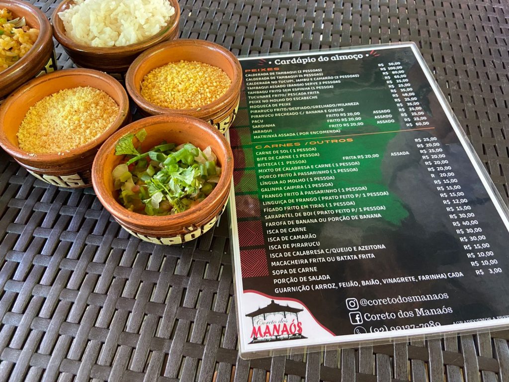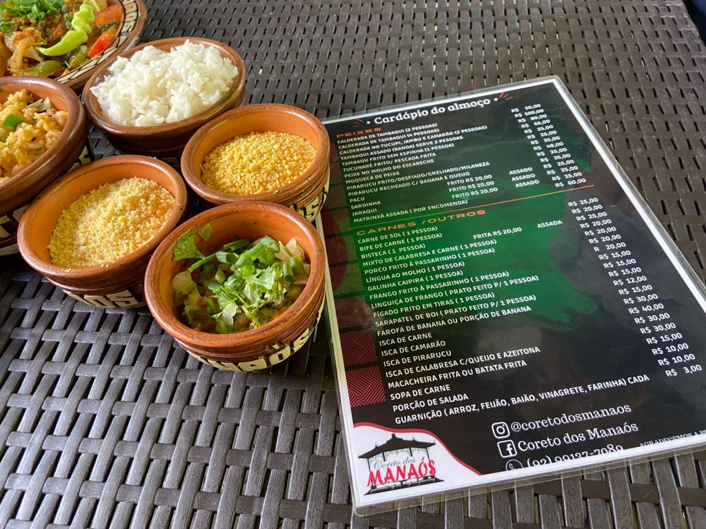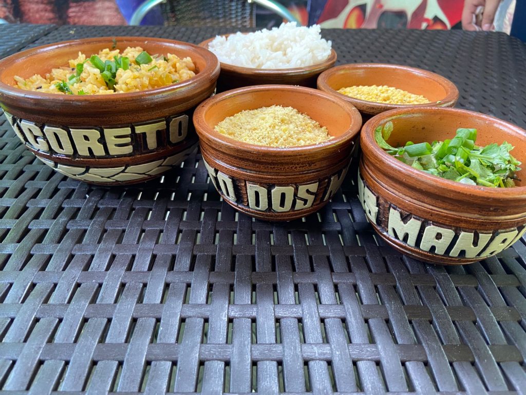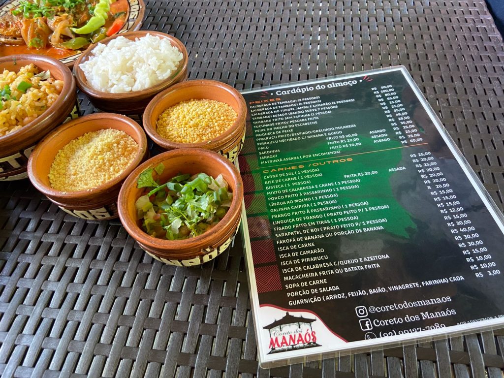 Os acompanhamentos são farinha da ovinha (tradicional do Amazonas), baião, arroz branco, feijão e vinagrete. Este pedido pode servir duas pessoas ou uma que coma muuiitoo.