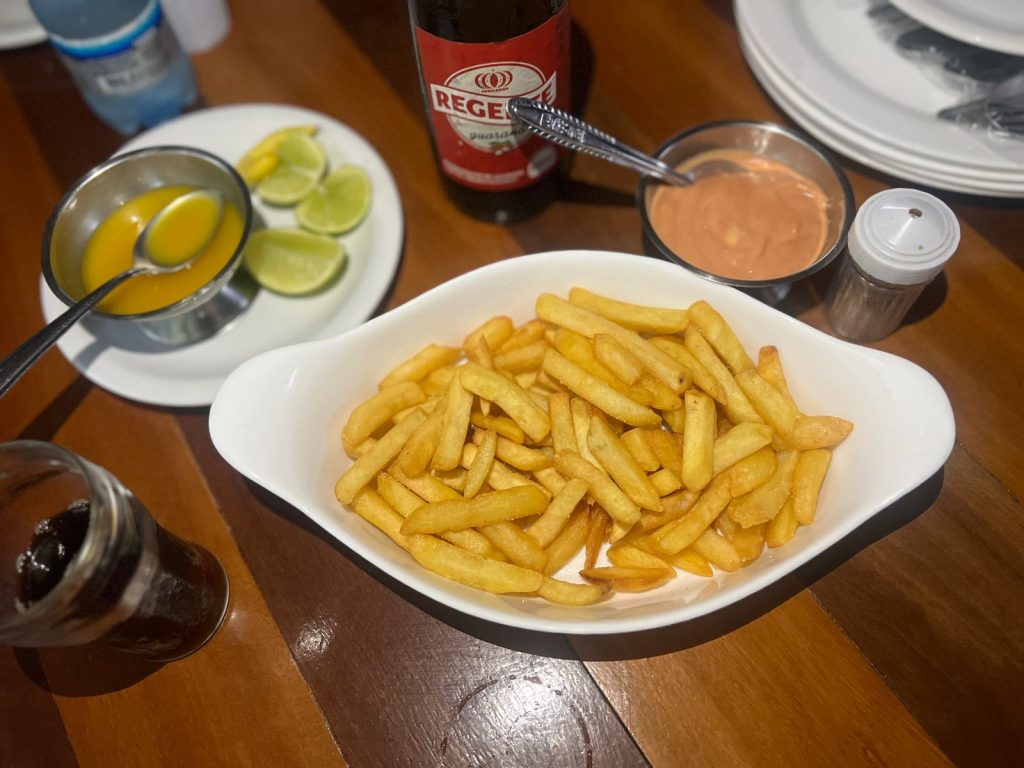 De início eles servem um caldinho de peixe, que é pela conta da casa, pra abrir o apetite. Você também encontra entradinhas, como bolinho de camarão e batata frita.