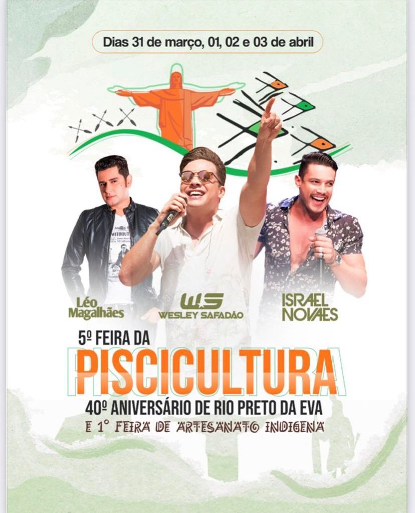 Na 5ª Feira de Piscicultura vai acontecer o 40º Aniversário de Rio Preto da Eva e a 1ª Feira de Artesanato Indígena, onde vai receber artistas como Léo Magalhães, Wesley Safadão e Israel Novaes para animar a festa.