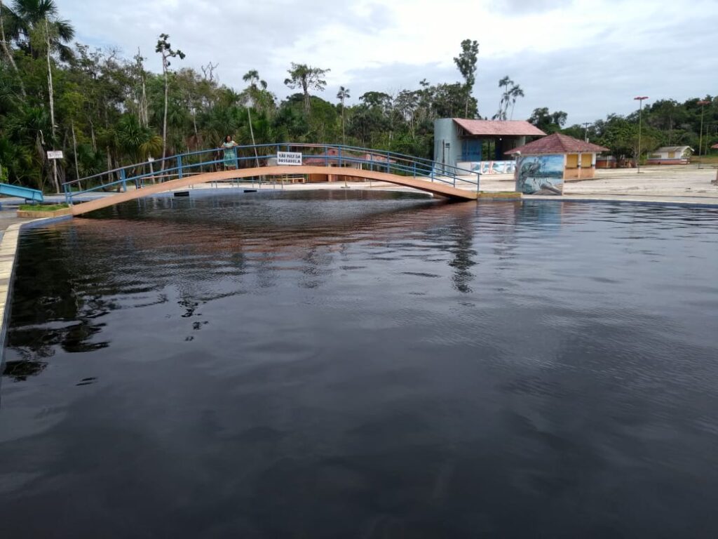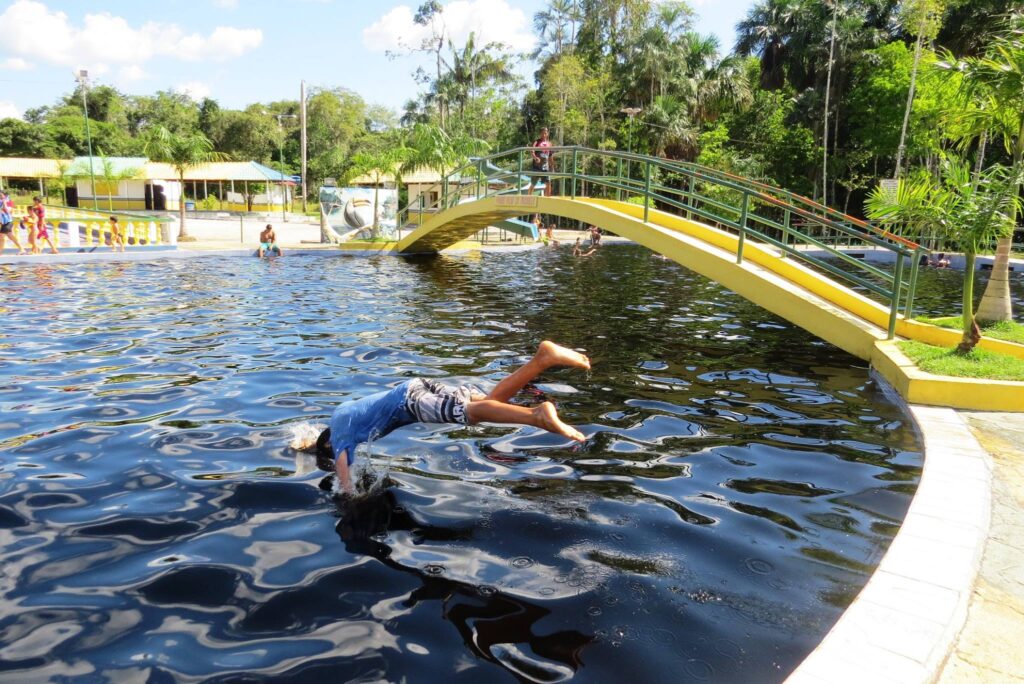 Se olhar rápido o local não tem muita diferença de outros balneários com piscinas, exceto por um detalhe especial as águas da piscina são naturais, são duas piscinas para crianças e adultos que são cheias com igarapé que fica em frente do balneário. Você pode ter duas opções, ou aproveita a piscina ou igarapé com as árvores de pano de fundo na paisagem.