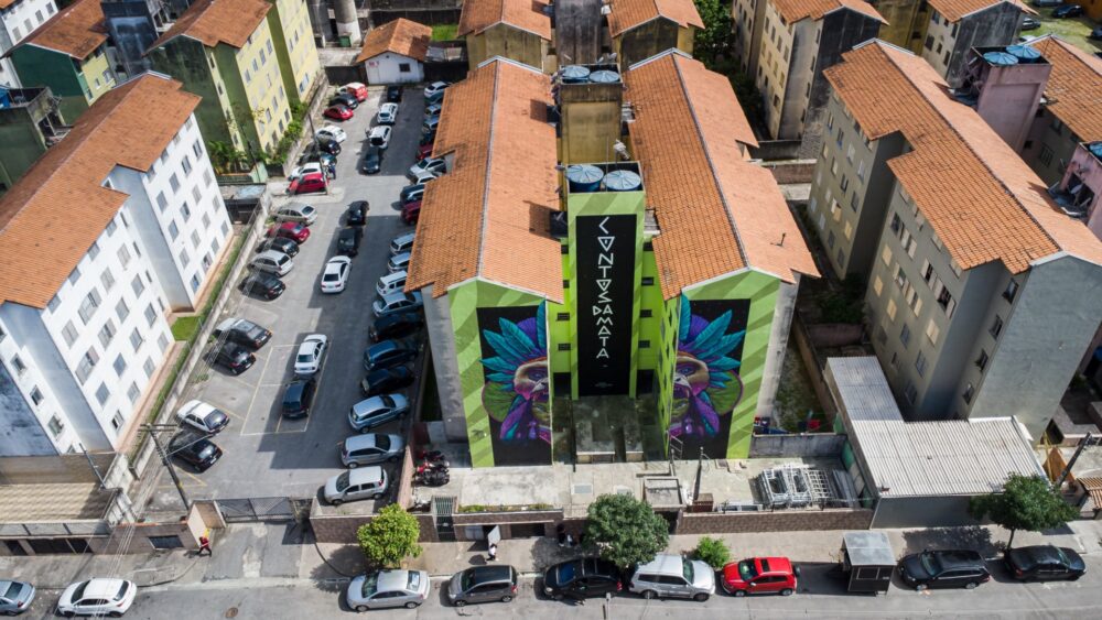 Ao todo, a composição conta com três colunas laterais, totalizando 300 metros de empena, e está localizada na rua Jair da Rosa Pinto, número 47, no bairro Parque das Nações, zona Oeste de São Paulo. Através da junção, é possível visualizar a Macaca Guariba acima de uma mulher indígena, os contrastes e cores da floresta, além do título do projeto “Contos da Mata” bem ao centro, que demonstra o propósito da contação de uma história ancestral, sendo essa uma das principais marcas do artista.