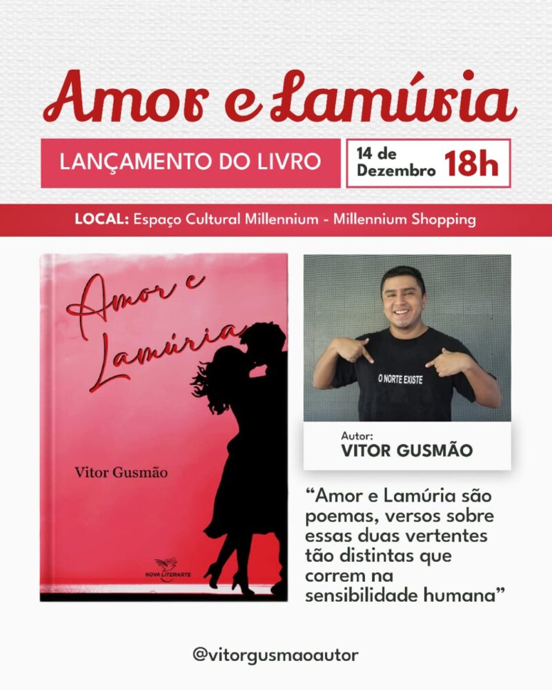 Neste sábado (14/12), será lançado o livro “Amor e Lamúria”, no Millennium Shopping, às 18h. A obra, composta por poemas, convida o leitor a explorar a dualidade entre o amor e a dor, capturando a complexidade da sensibilidade humana.