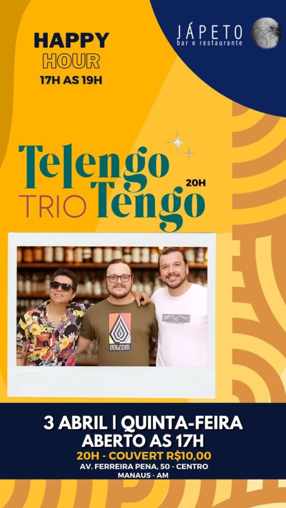 O Trio Telengo Tengo, formado pelos músicos Denilson Novo (guitarra e violões), Clóvis Rodrigues (vocais) e Mateus Simões (bateria e percussão), fará um show especial nesta quinta-feira, 3 de abril, no Japeto Bar e Restaurante, localizado na Rua Ferreira Pena, 50 – Centro de Manaus.