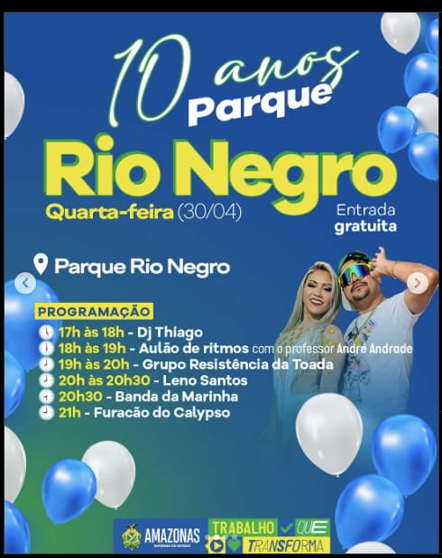 O Parque Rio Negro, um dos principais espaços de lazer e convivência de Manaus, está em festa! Para celebrar seus 10 anos de história, o local preparou uma programação especial que se estende até quarta-feira, 30 de abril, com atividades culturais, musicais e gastronômicas voltadas para toda a família.