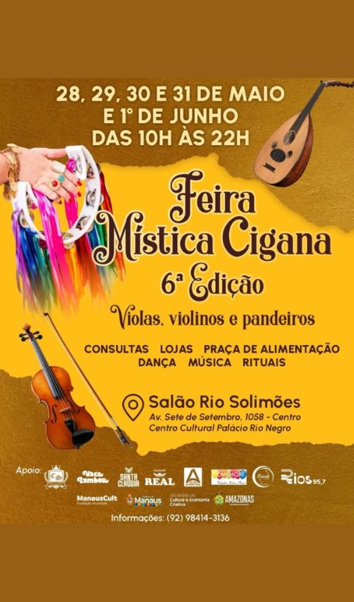 A Feira Mística Cigana retorna a Manaus em sua 6ª edição, oferecendo uma imersão na cultura cigana com o tema “Violas, Violinos e Pandeiros”. O evento gratuito ocorre de 28 de maio a 1º de junho, das 10h às 22h, no Salão de Eventos Rio Solimões, no Palácio Rio Negro, localizado na Avenida Sete de Setembro, 1546, Centro de Manaus .