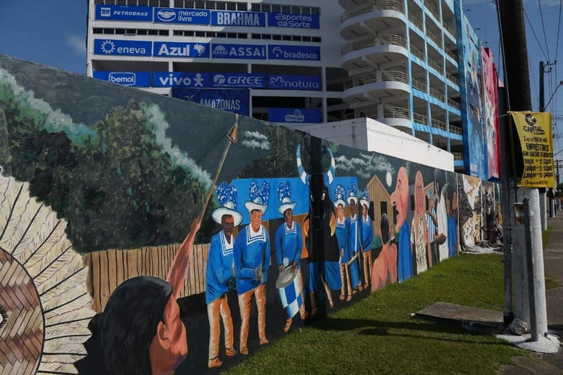 • Área externa com obras em relevo no muro do Bumbódromo, que retratam lendas, contos e cenas do cotidiano ribeirinho, criadas por artistas da Associação dos Artistas Plásticos de Parintins (AAPP).