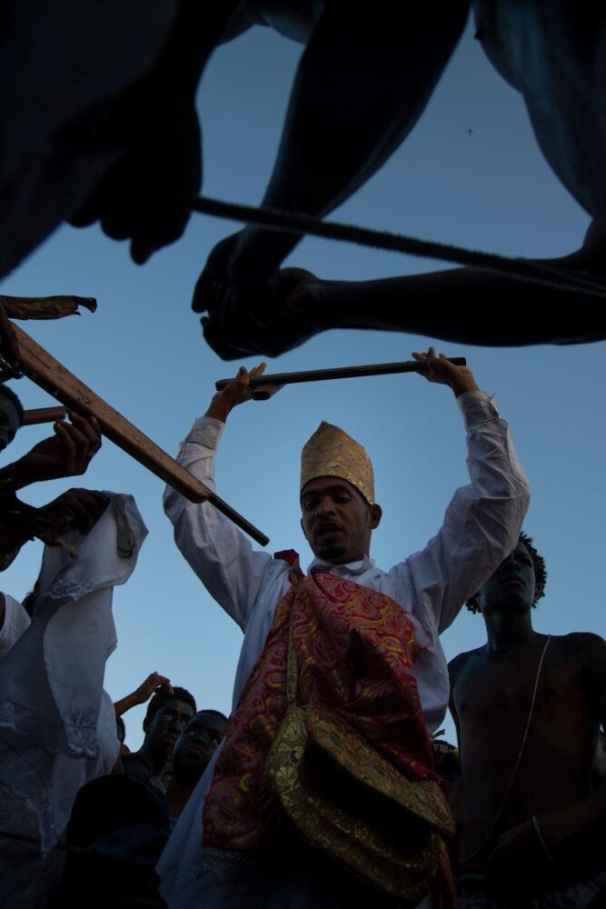 Com foco em práticas de resistência e preservação da memória afro-brasileira, “Nego Fugido” propõe uma imersão visual e sonora no ritual encenado anualmente pela comunidade quilombola de Acupe (BA). O evento celebra, por meio de quadros vivos, a luta dos escravizados por liberdade.