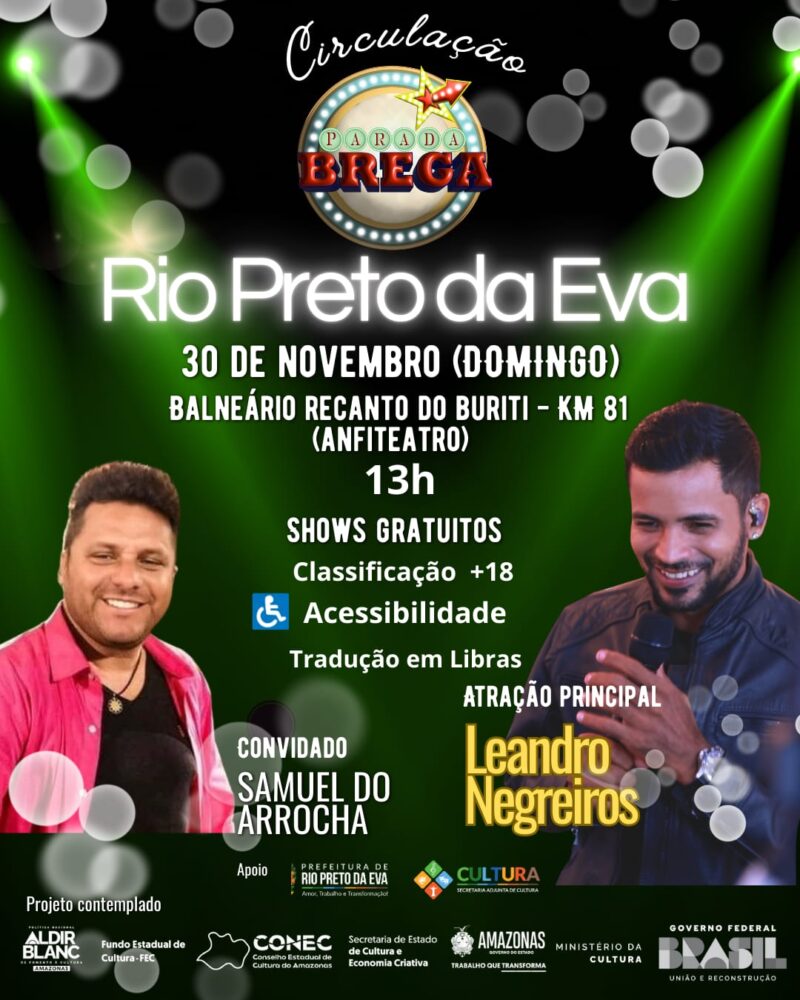 O Parada Brega Circulação chega ao seu último destino neste domingo, 30 de novembro de 2025, a partir das 13h, no Anfiteatro do Balneário Recanto do Buriti, em Rio Preto da Eva. Após percorrer diferentes municípios ao longo do ano, o projeto encerra sua trajetória com um evento gratuito, voltado para maiores de 18 anos e com estrutura completa de acessibilidade.