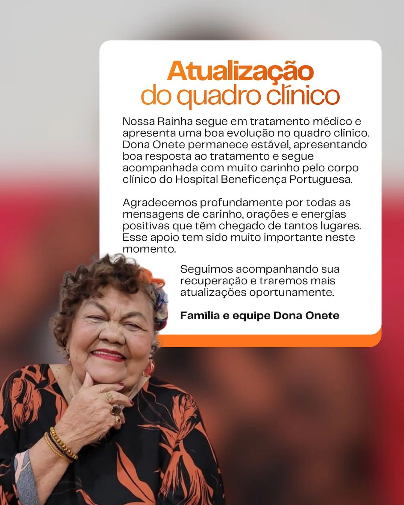 De acordo com o comunicado, a cantora permanece estável e tem respondido bem ao tratamento. Dona Onete está sendo acompanhada pela equipe médica do Hospital Beneficência Portuguesa, onde recebe cuidados e acompanhamento constante.